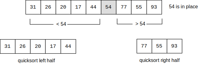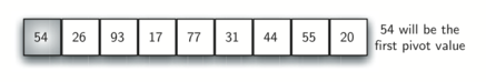 FigureΒ 5.11.1 shows that 54 will serve as our first pivot value. Since we have looked at this example a few times already, we know that 54 will eventually end up in the position currently holding 31. The partition process will happen next. It will find the split point and at the same time move other items to the appropriate side of the list, either less than or greater than the pivot value.