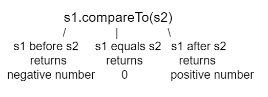 int compareTo(String other) : returns a value < 0 if this is less than other; returns zero if this is equal to other; returns a value > 0 if this is greater than other.