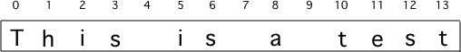 A string holds characters in a sequence. Each character is at a position or index which starts with 0 as shown below. An index is a number associated with a position in a string. The length of a string is the number of characters in it including any spaces or special characters. The string below has a length of 14.