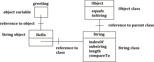 Figure6.14.3.Figure 2: Object variable of type String with a reference to a String object which has a reference to the String class which has a reference to the Object class.